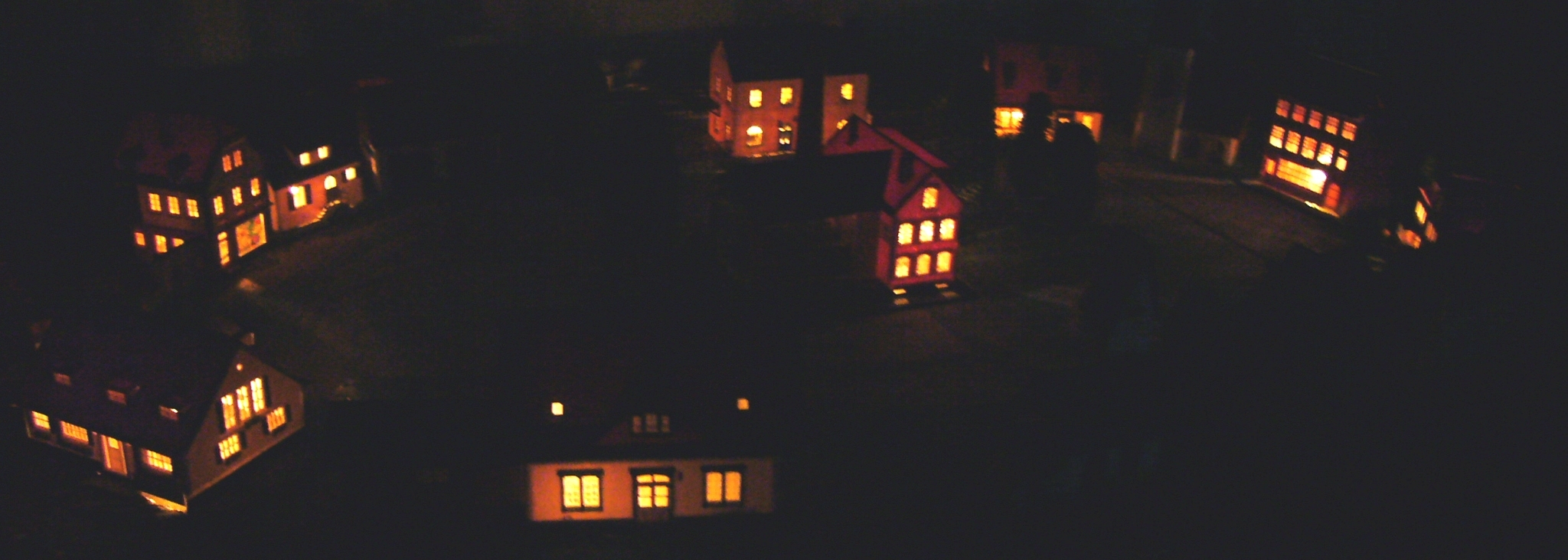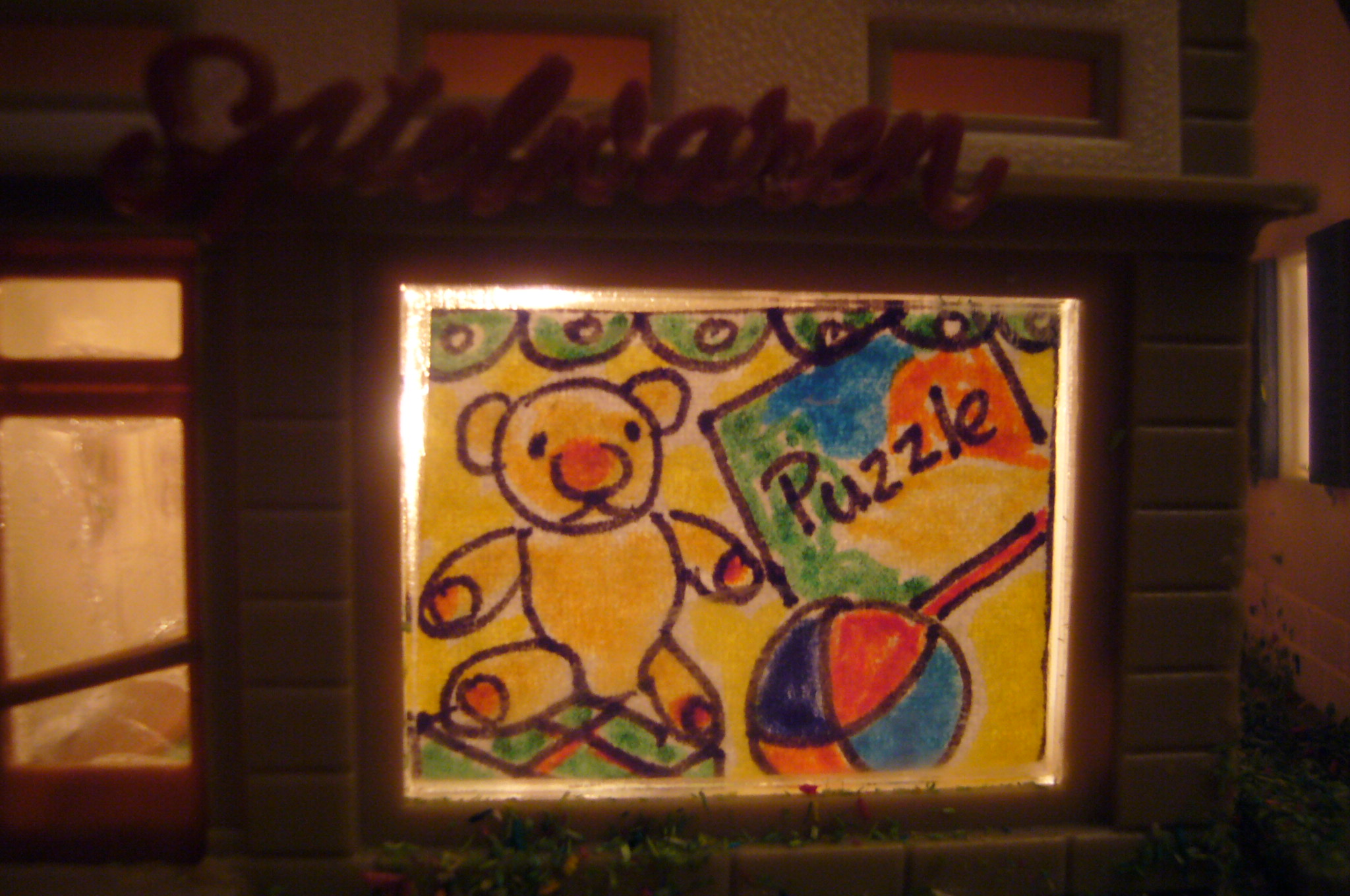 Der Spielwarenladen aus der Sicht der Dorfbewohner bei Nacht:
